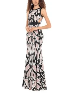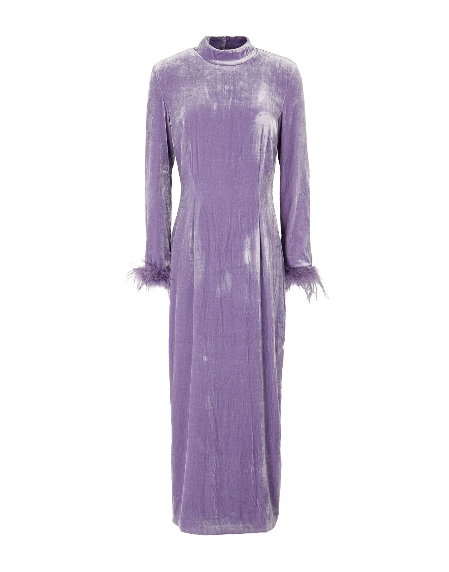 Quest’abito lungo in velluto vanta una silhouette elegante leggermente più stretta sul punto vita. A maniche lunghe e foderato all’interno, è disegnato con scollo tondo, spacchetto sul retro, chiusura con zip e impreziosito con piume ton sur ton sul fondo manica.La modella indossa una taglia S/40