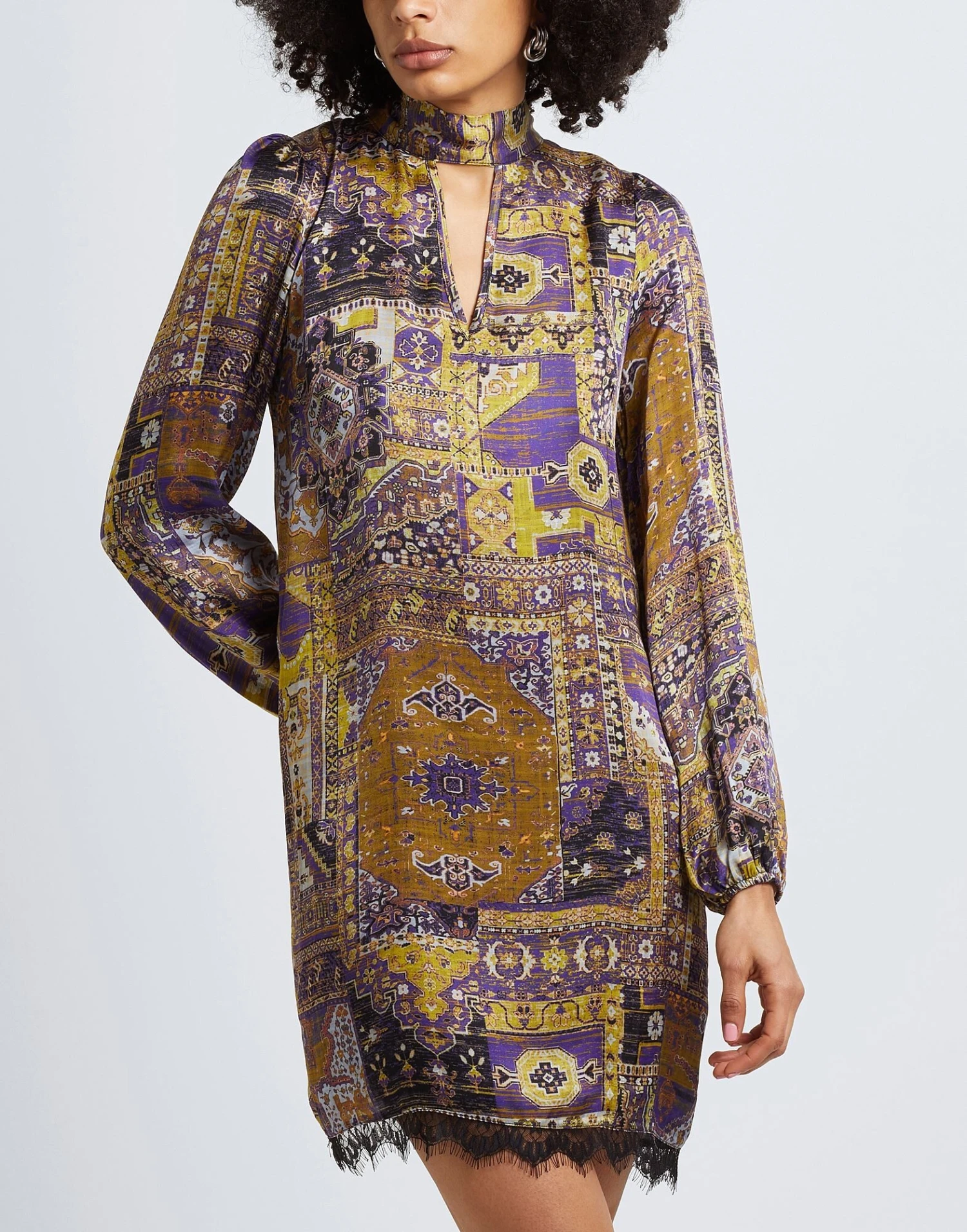 raso, pizzo, arricciature, fantasia multicolore, collo alto, maniche lunghe, polsini con elastico, interno sfoderato, chiusura con laccetti, senza tasche, vestito