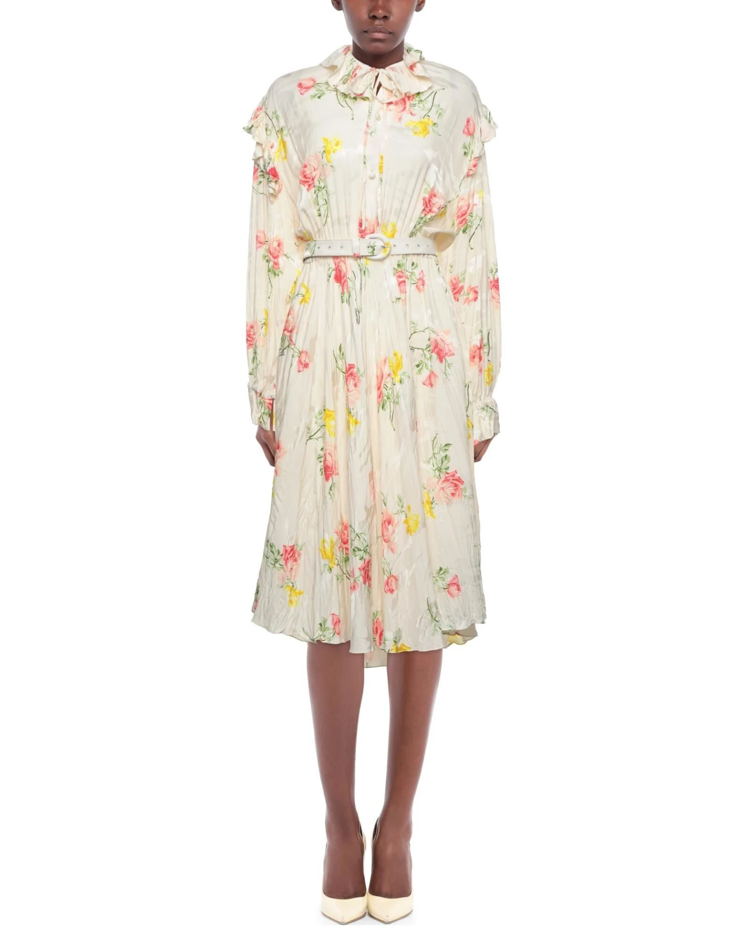 tela, laccetti, cintura, fantasia floreale, collo tondo, maniche lunghe, interno sfoderato, bottoni, senza tasche