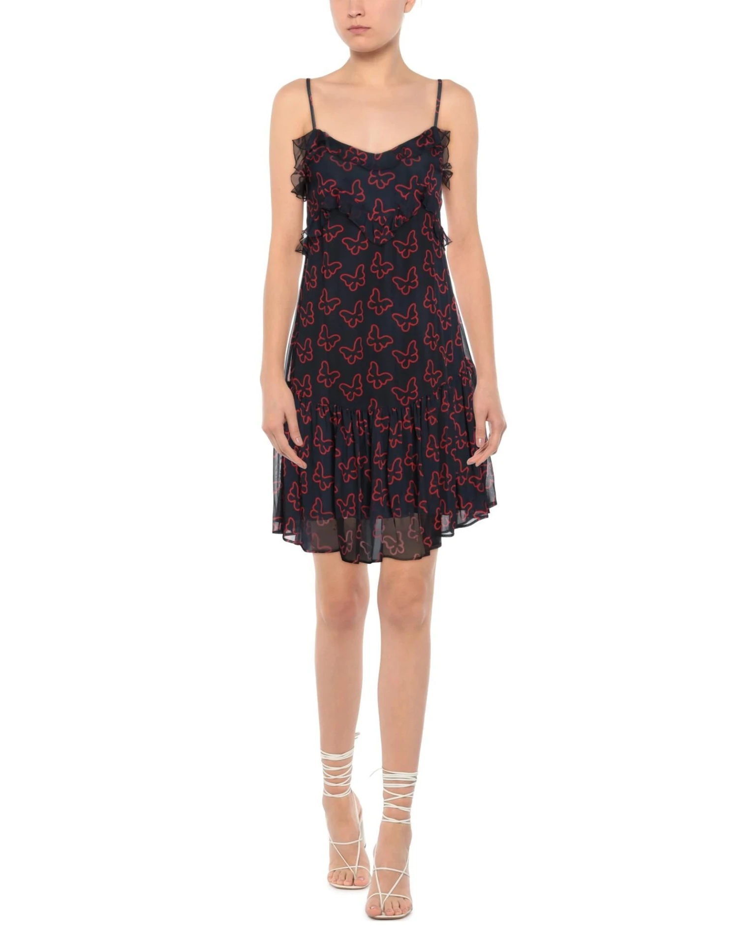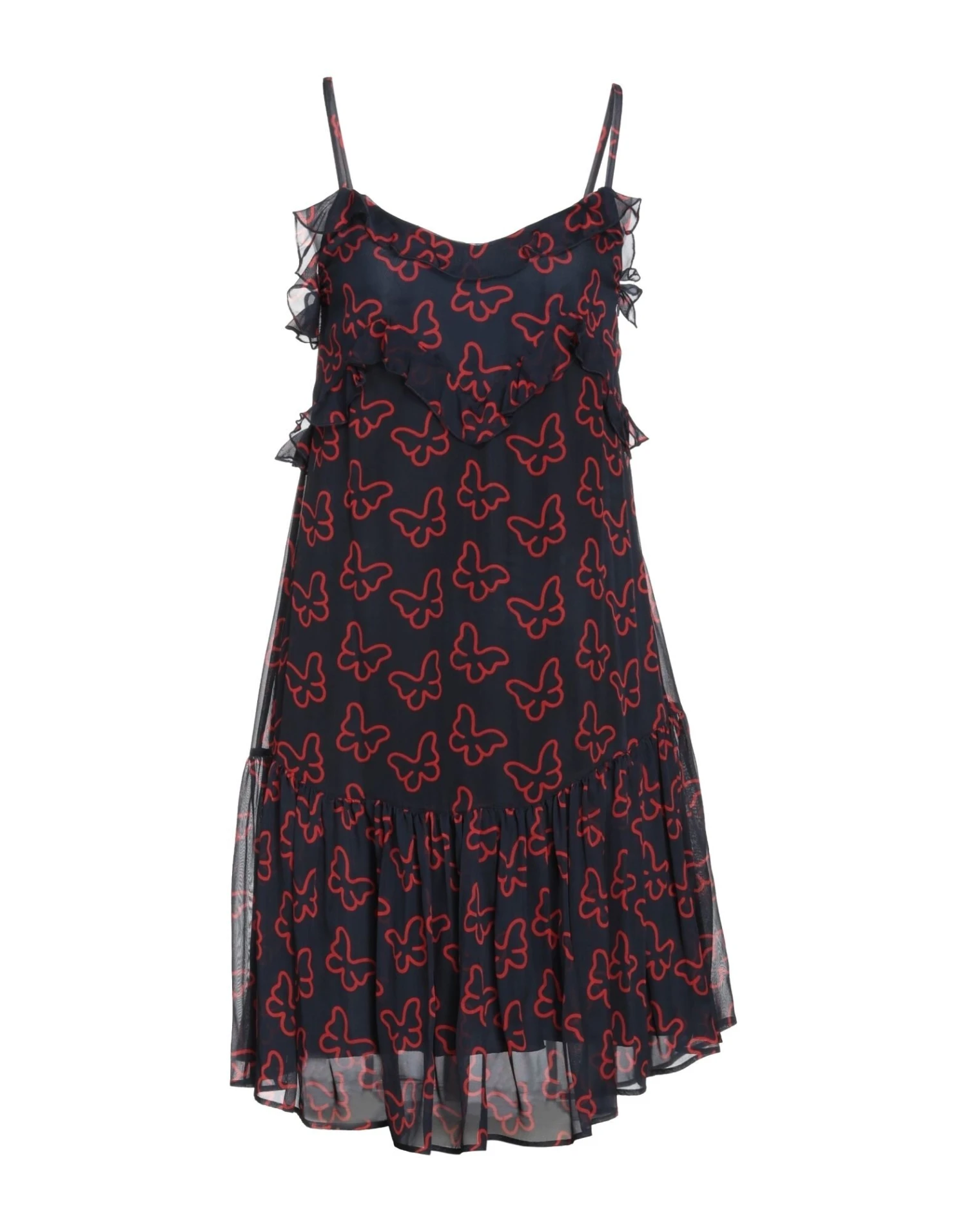 crêpe, arricciature, ruches, fantasia bicolore, collo ampio, senza maniche, interno foderato, zip, senza tasche, modello a trapezio