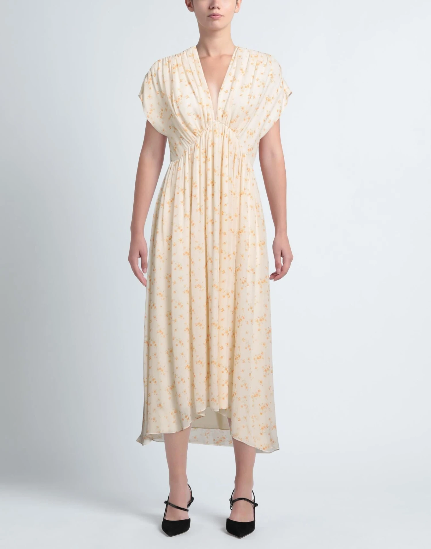 crêpe, arricciature, fantasia floreale, collo a v, maniche corte, interno foderato, multitasche, modello stile impero