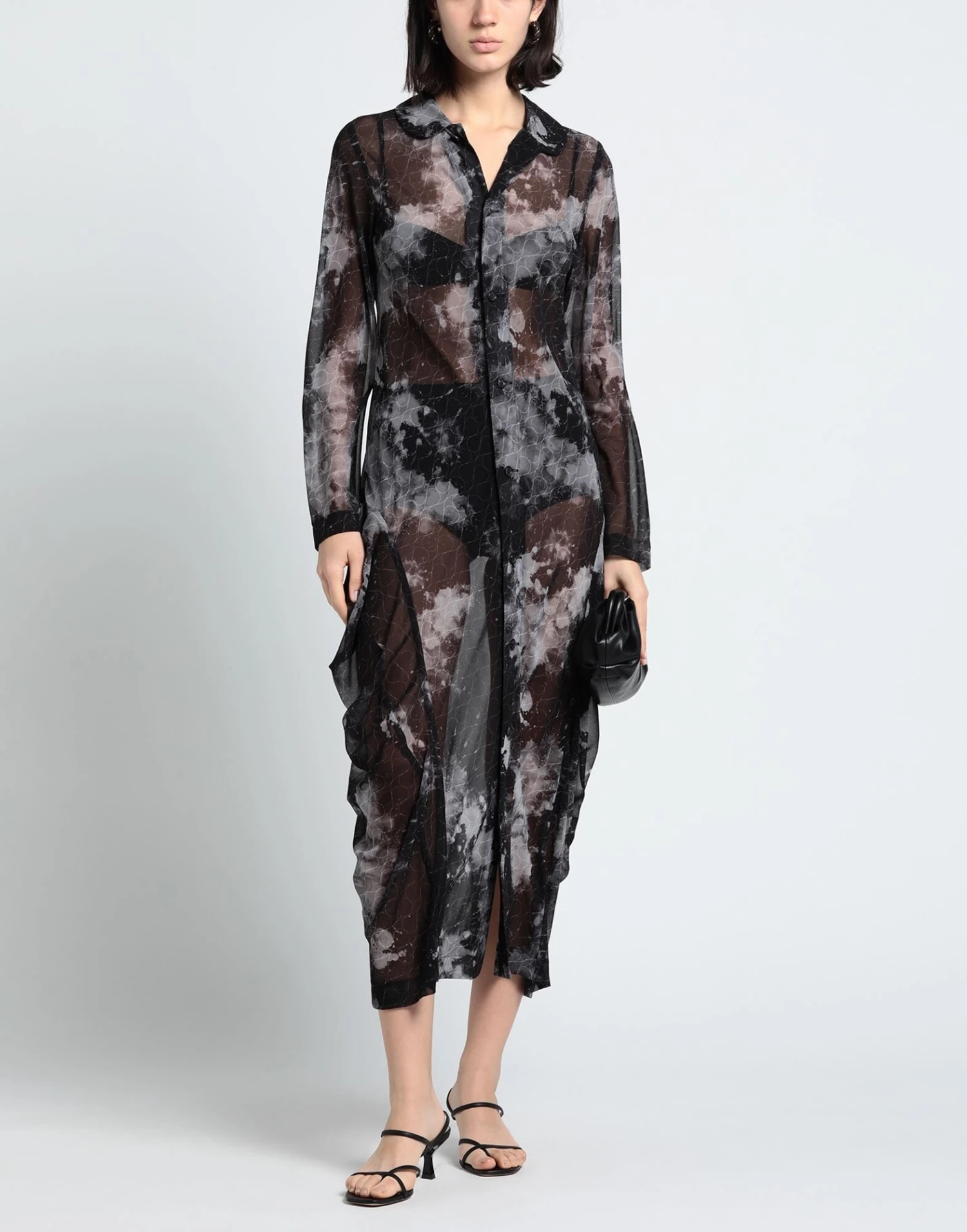 chiffon, ruches, fantasia bicolore, collo claudine, maniche lunghe, senza tasche, chiusura sul fronte, bottoni, interno sfoderato, vestibilità ampia