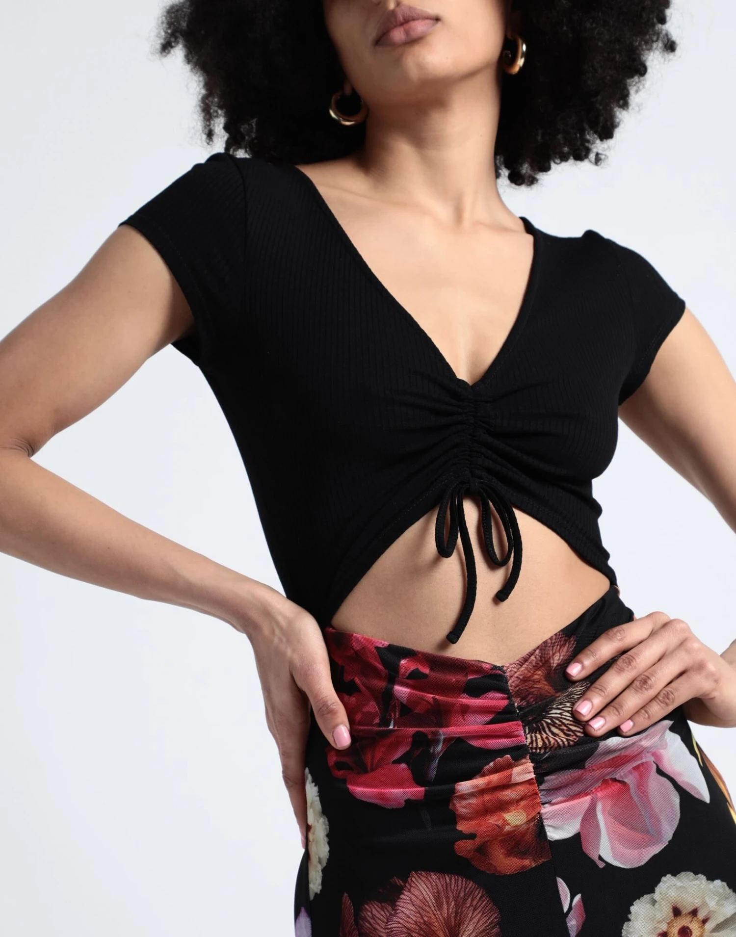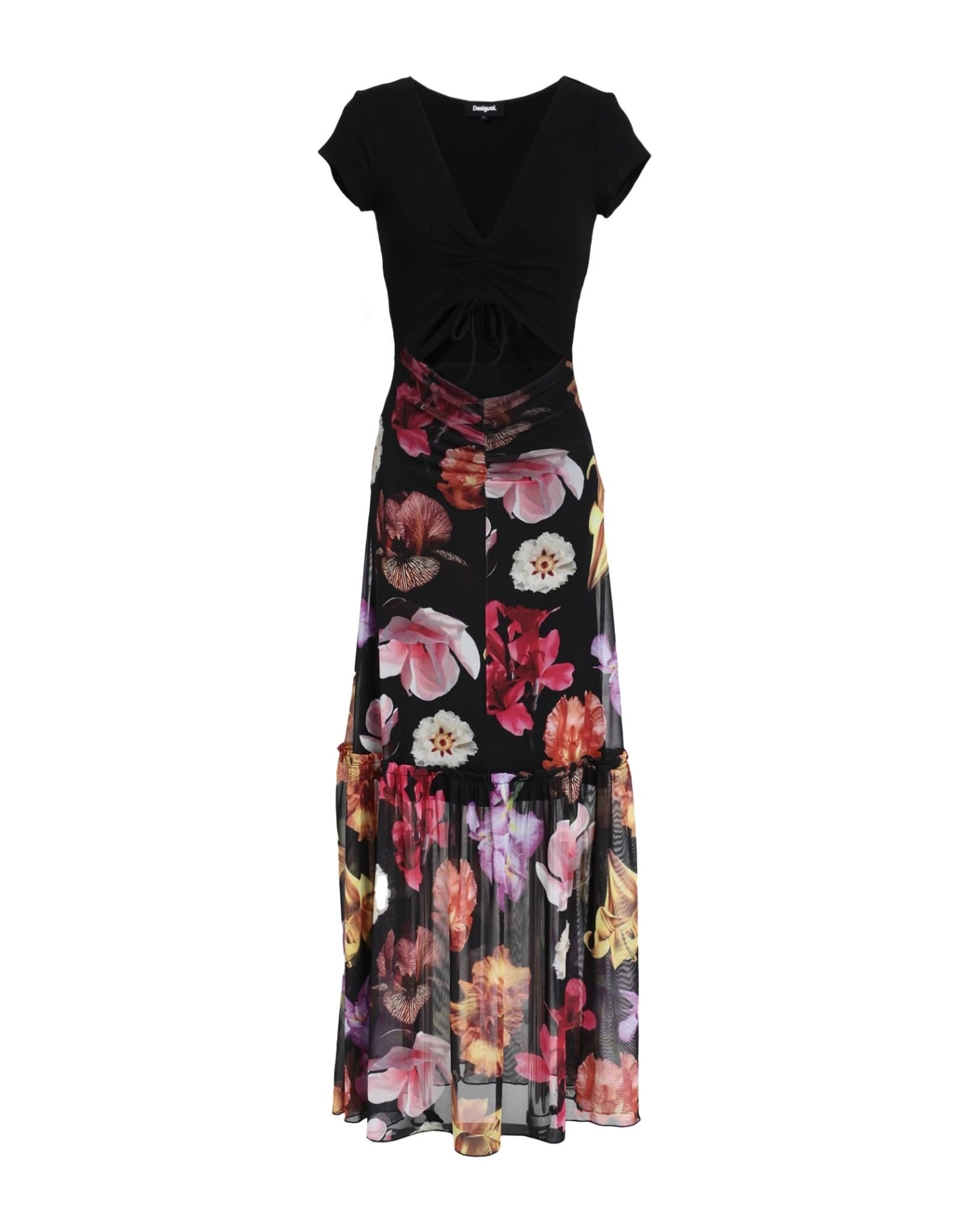 jersey, tulle, lavorazione a coste, arricciature, tinta unita, fantasia floreale, collo a v, interno parzialmente foderato, modello stile impero