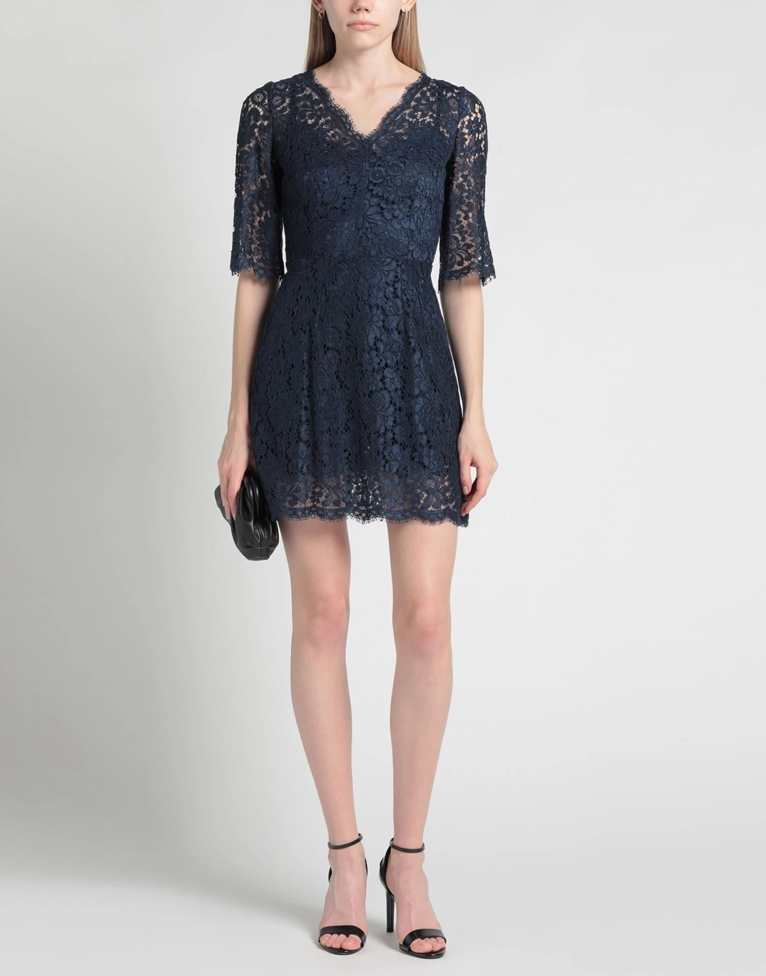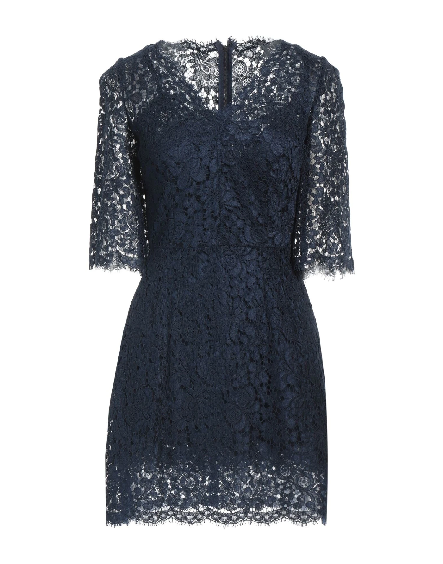 pizzo, senza applicazioni, tinta unita, collo tondo, maniche a 3/4, senza tasche, sottoveste interna, chiusura sul retro, zip e gancetto, modello a trapezio
