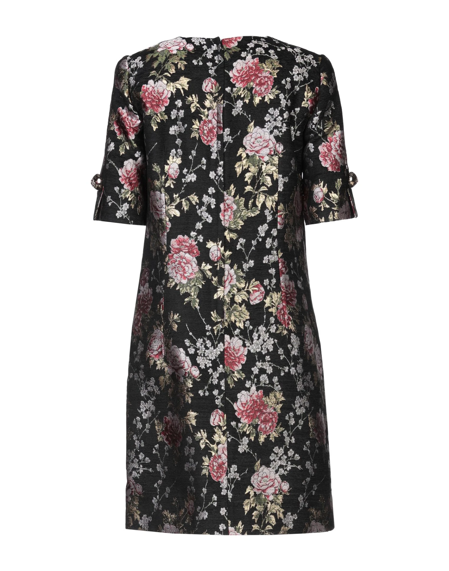 broccato, strass, applicazioni a contrasto, fantasia floreale, collo tondo, maniche corte, senza tasche, chiusura sul retro, zip, interno foderato