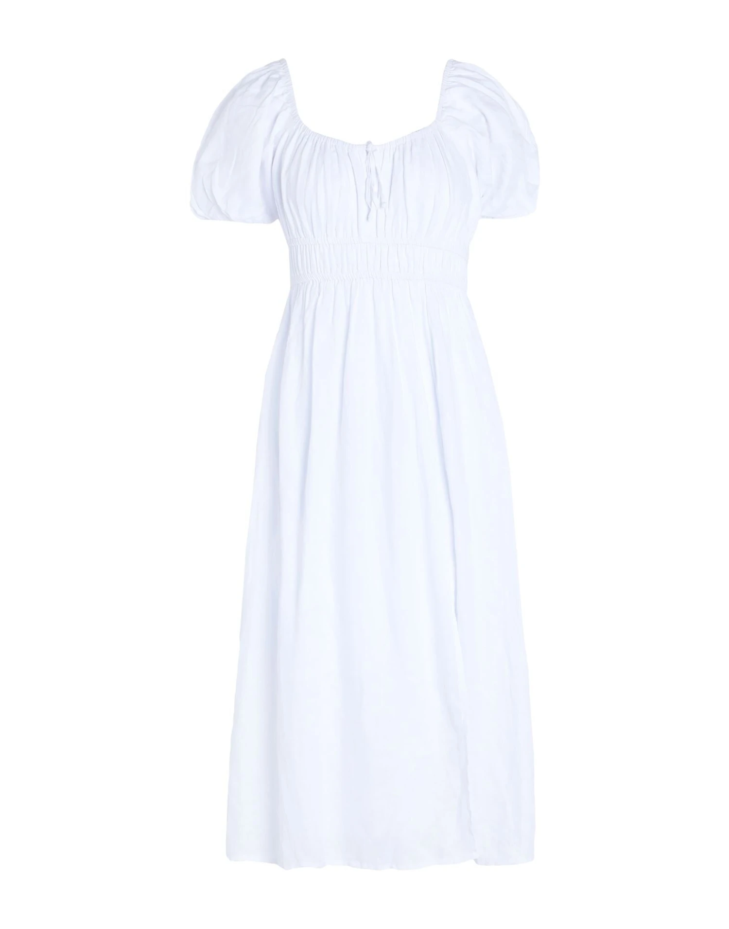 tela, arricciature, laccetti, tinta unita, collo con scollatura quadrata, maniche corte, manica a sbuffo, interno foderato, spacco anteriore, modello stile impero