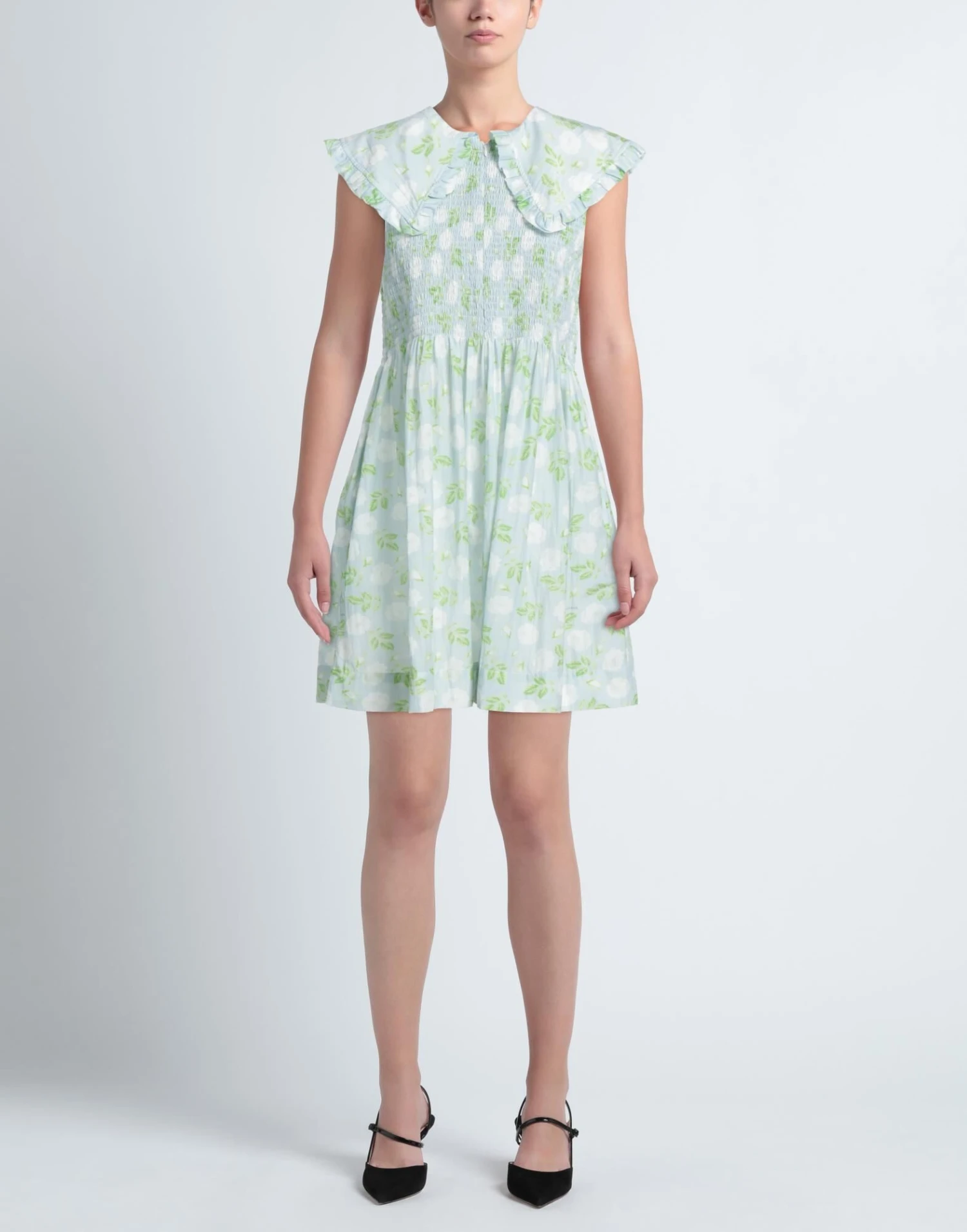 tela, arricciature, fantasia floreale, collo classico, maniche corte, zip, modello a trapezio
