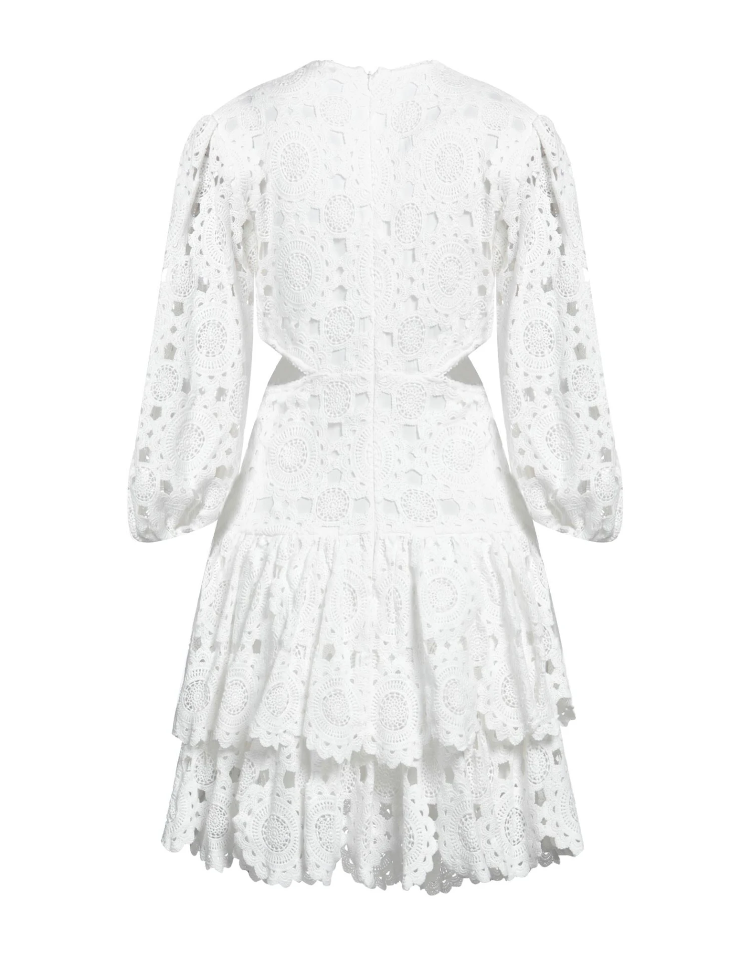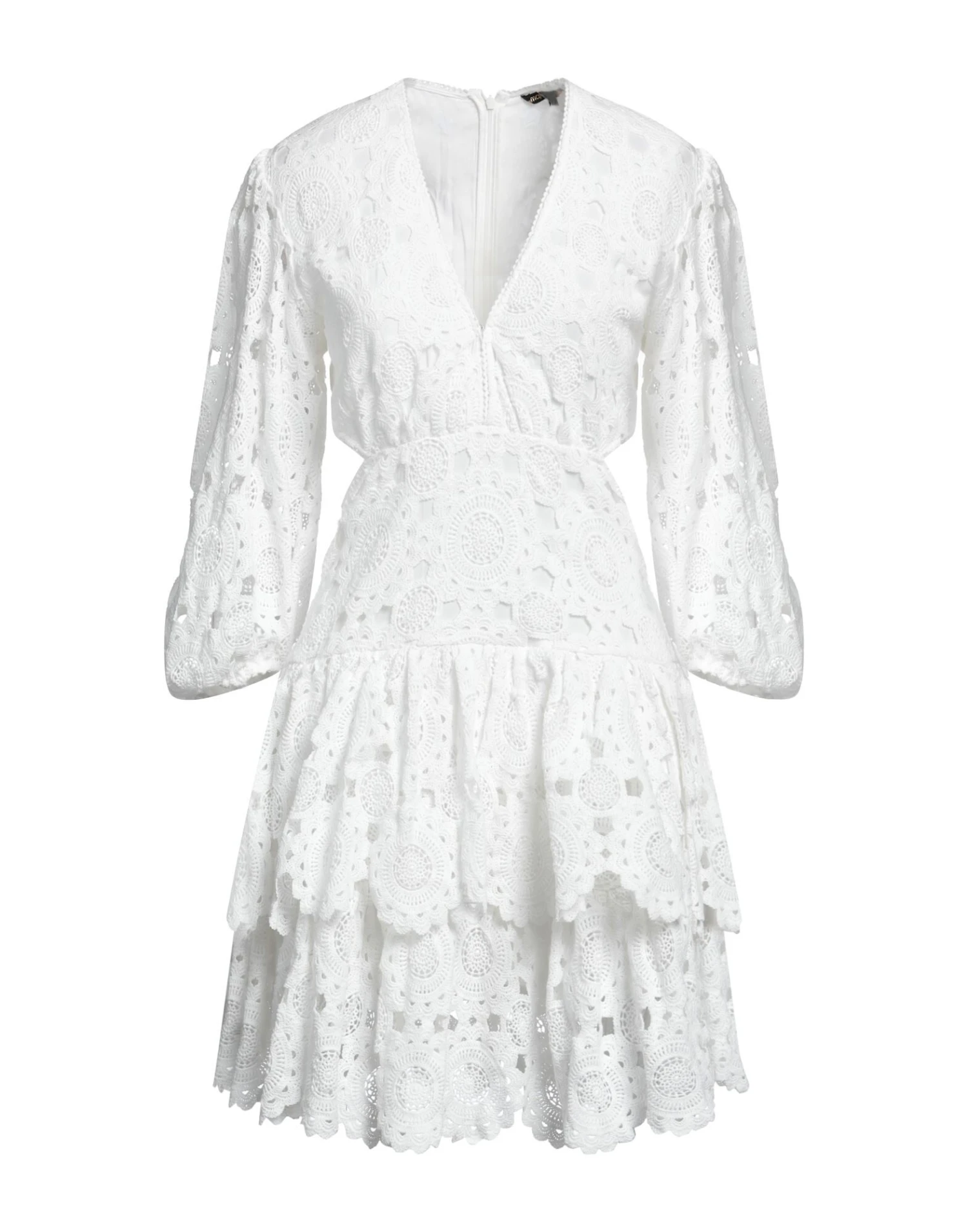 pizzo, senza applicazioni, tinta unita, collo a v, maniche a 3/4, polsini con elastico, interno foderato, zip, 1 bottone, senza tasche, fondo a balze, modello a trapezio