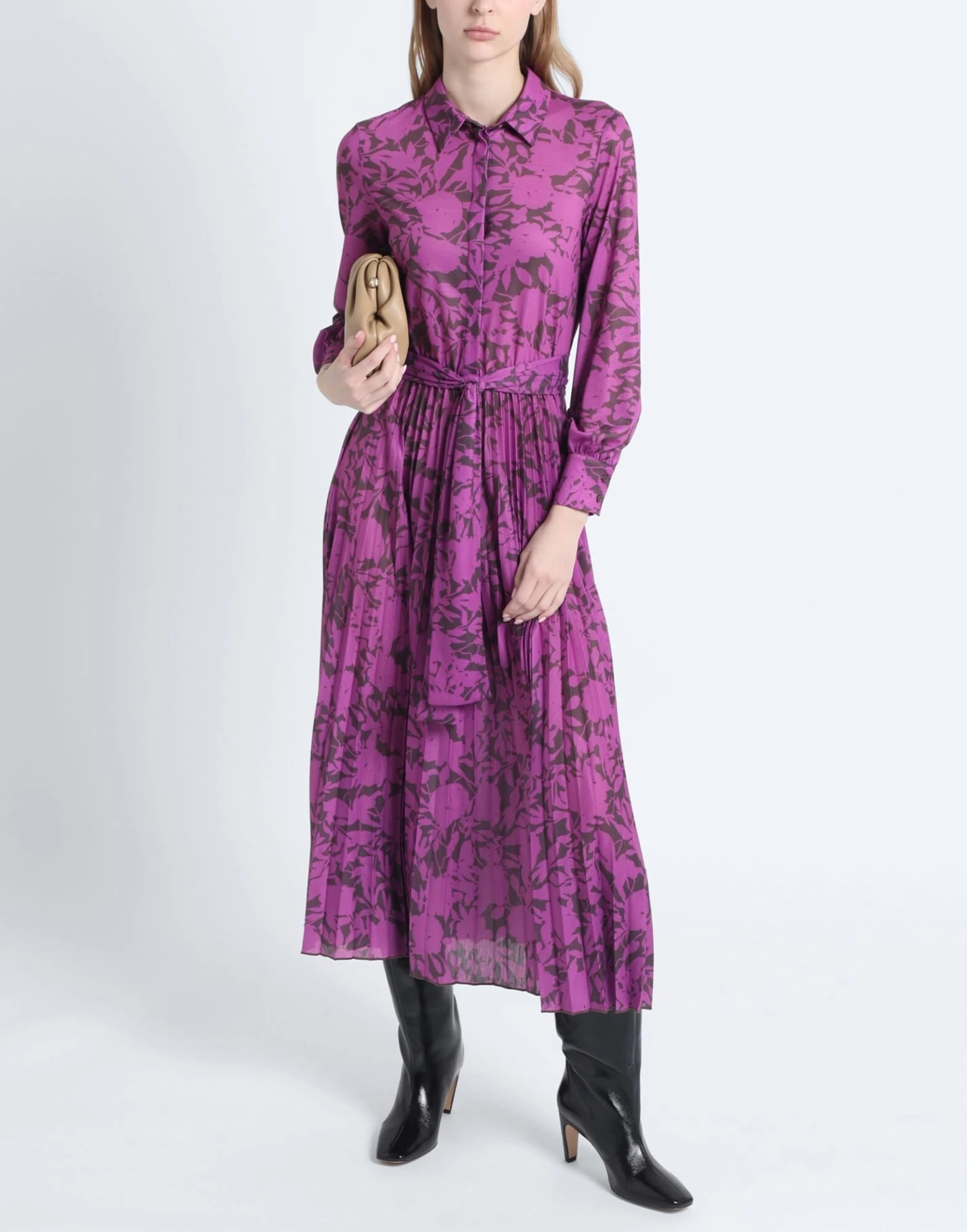 jersey, plissè, cintura, fantasia floreale, collo classico, maniche lunghe, polsini con bottoni, interno sfoderato, bottoni, modello chemisier