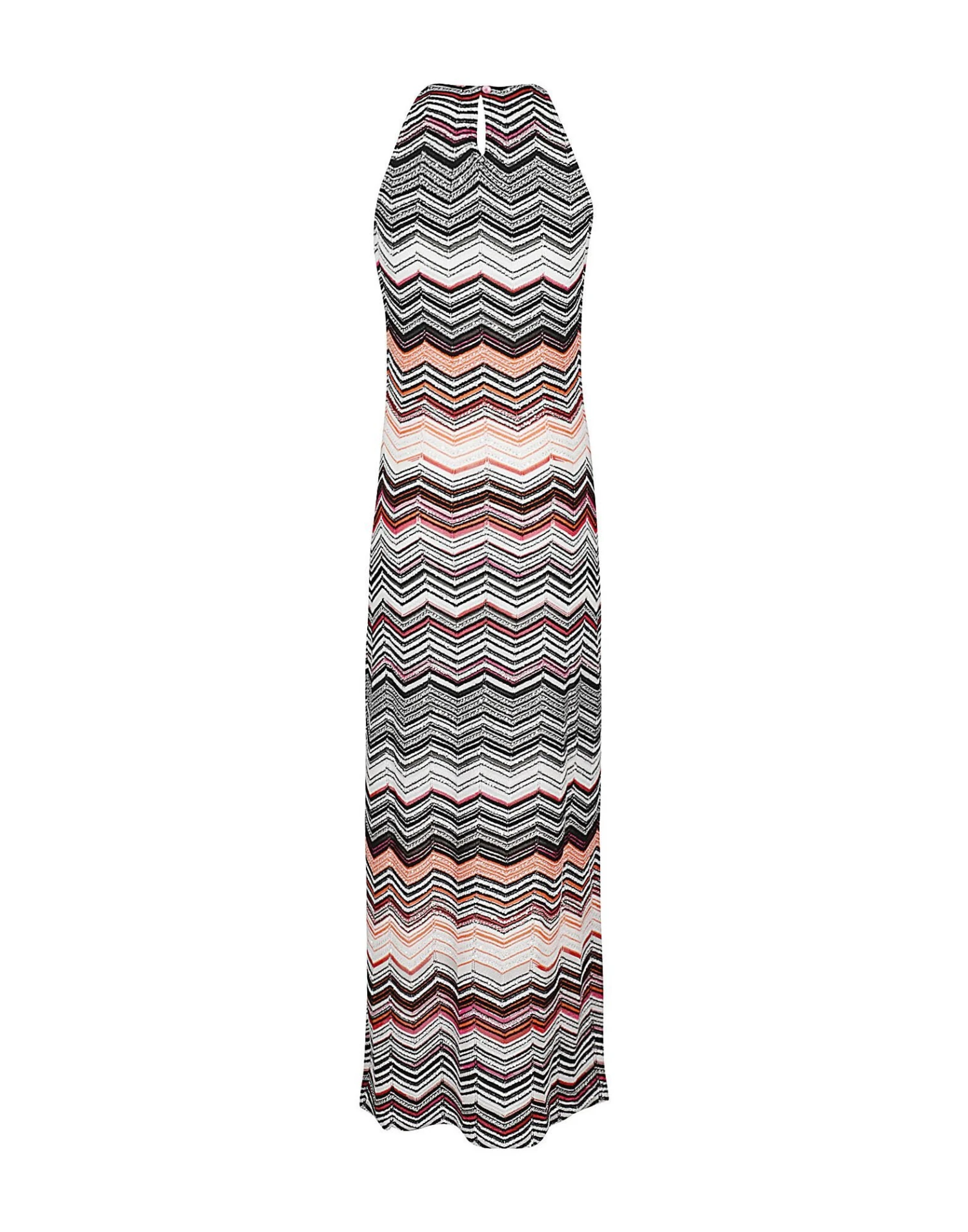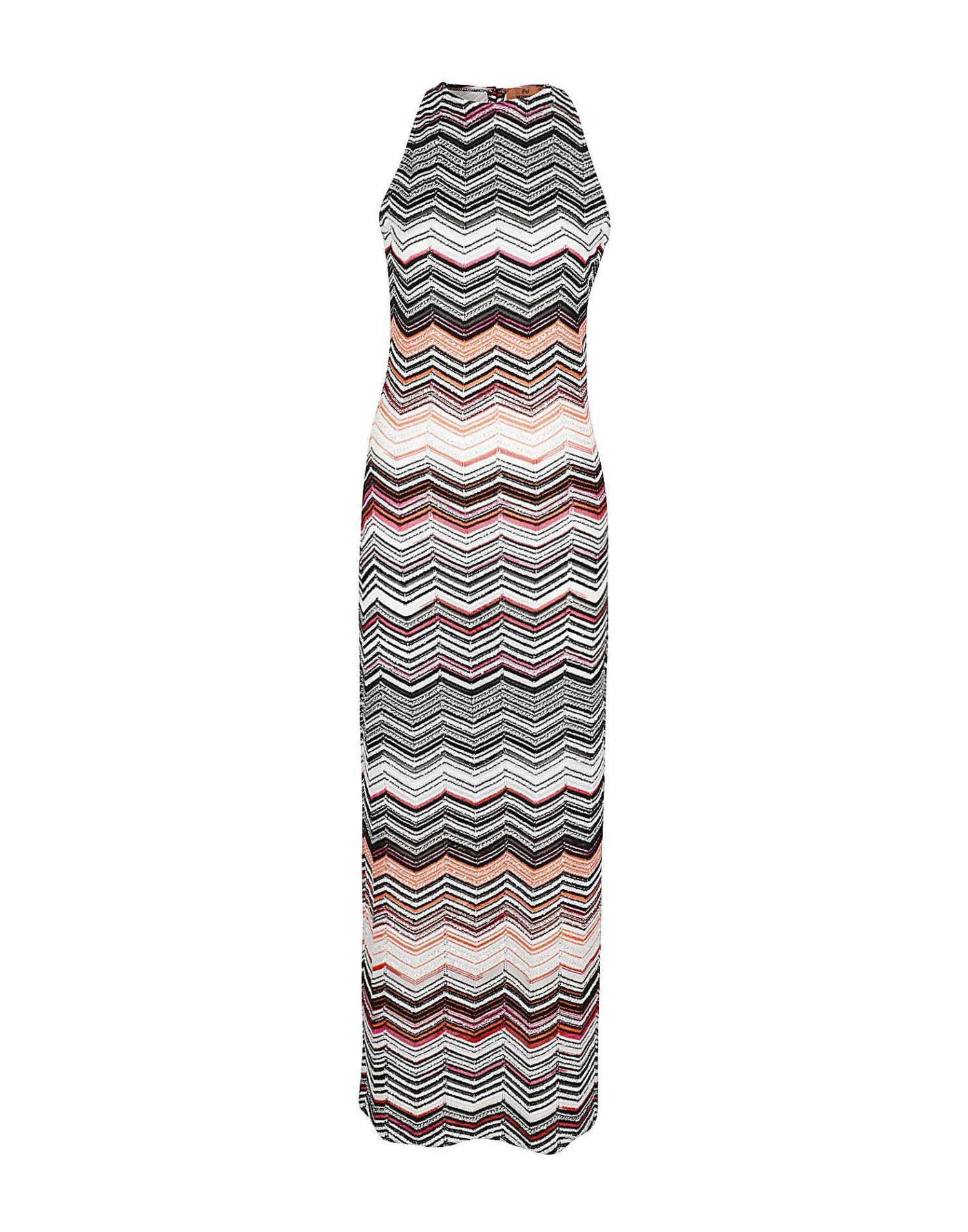 Abito lungo di Missoni, smanicato, girocollo, chiusura posteriore con bottone, disegno geometrico multicolore laminato.