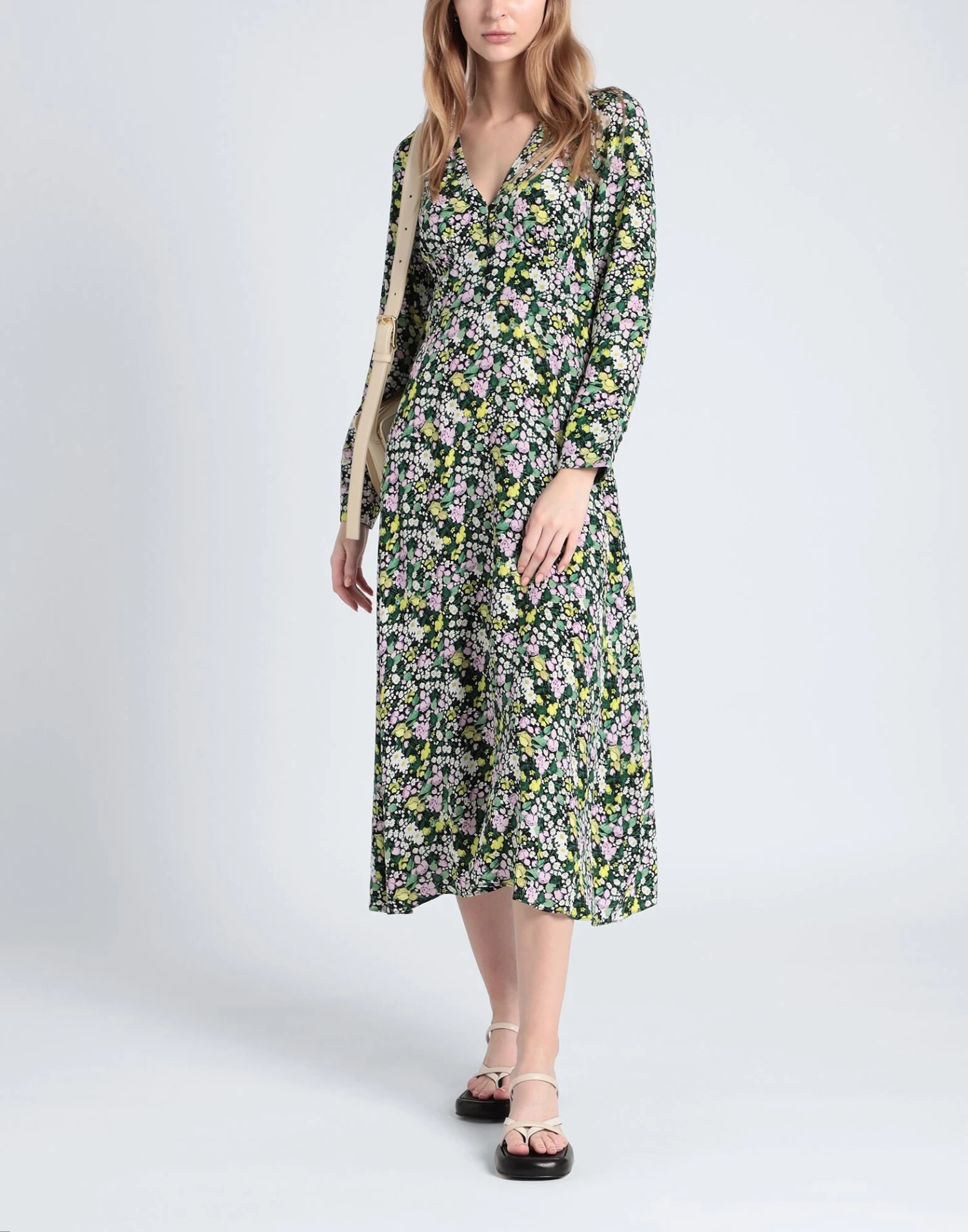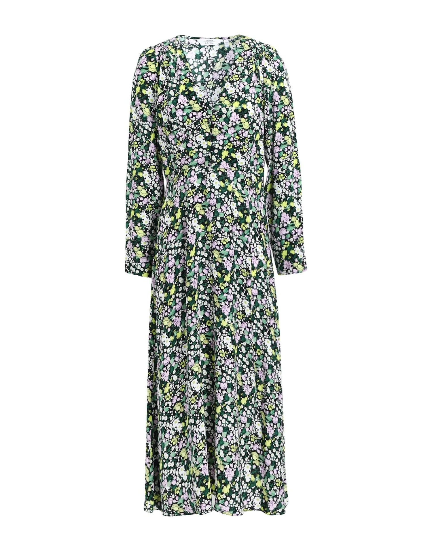 tela, arricciature, fantasia floreale, collo a v, maniche lunghe, polsini con bottoni, interno sfoderato, bottoni, zip, modello a trapezio