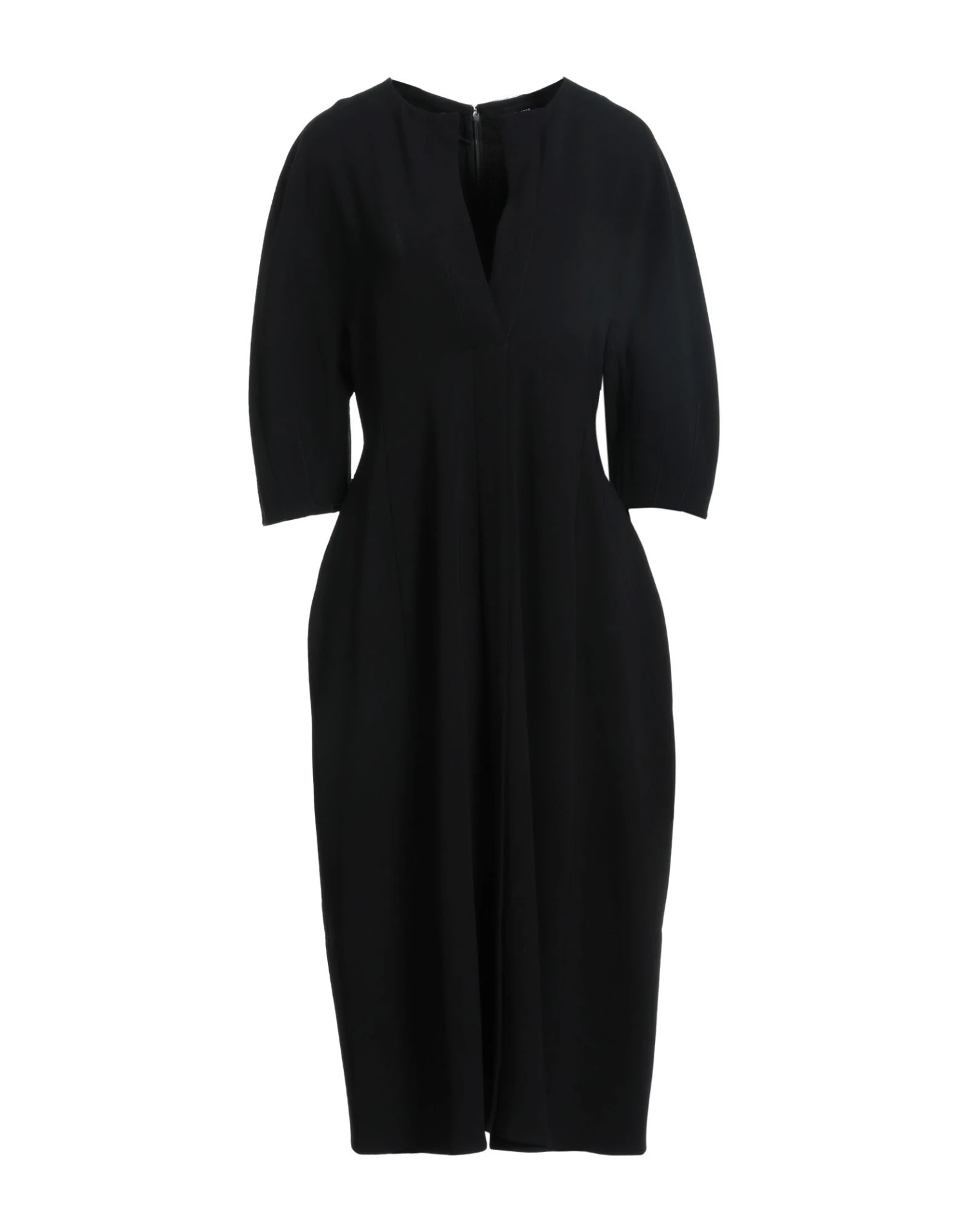crêpe, martingala, tinta unita, collo a v, maniche a 3/4, interno sfoderato, zip, multitasche, modello a trapezio