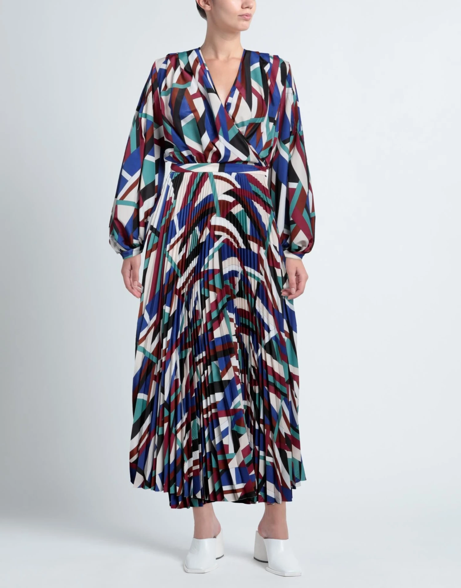 crêpe, plissè, senza applicazioni, fantasia multicolore, collo a v, maniche lunghe, interno sfoderato, automatici, senza tasche, modello chemisier