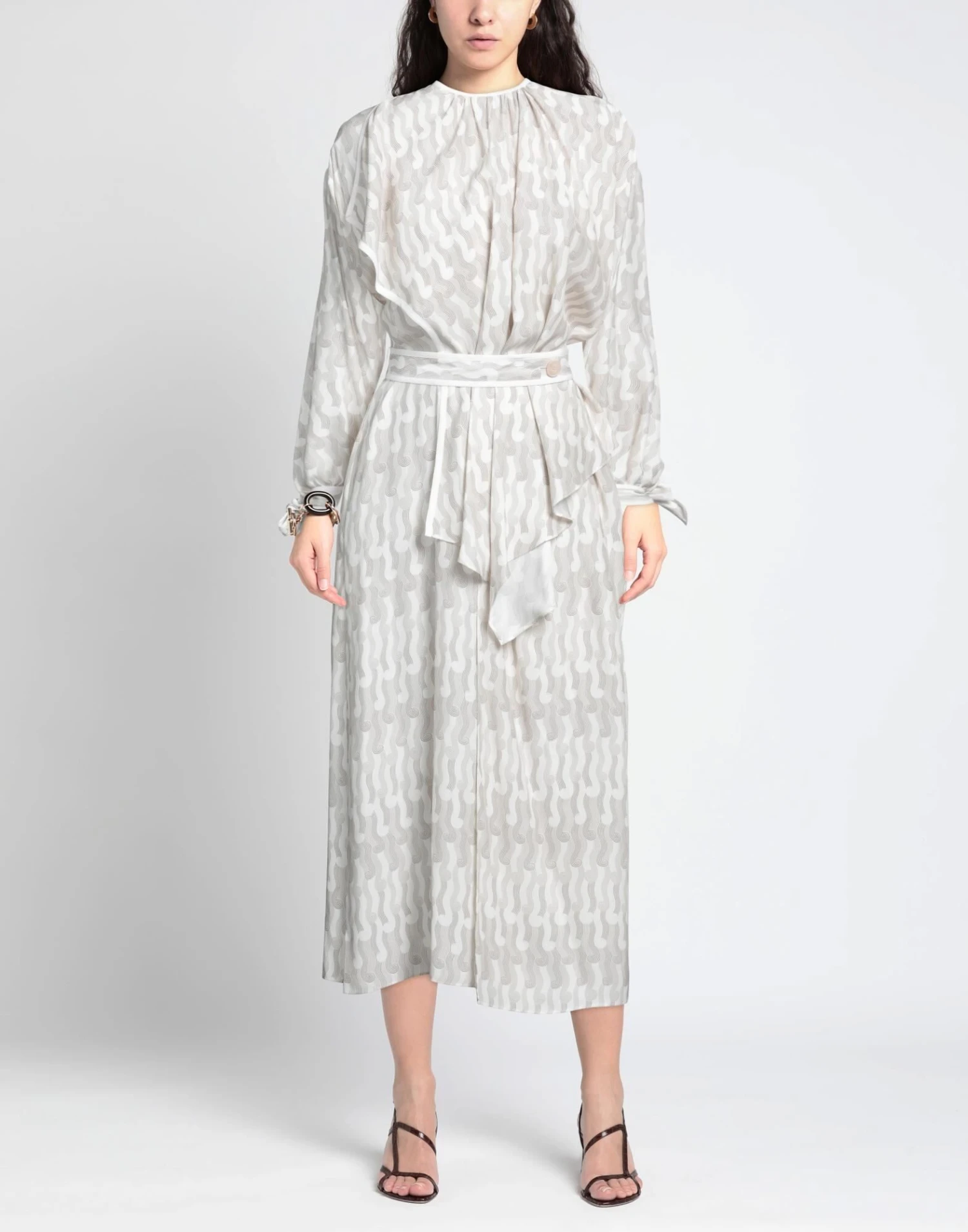 raso, cintura, ruches, fantasia multicolore, collo tondo, maniche lunghe, interno sfoderato, zip, gancetti, senza tasche, vestito