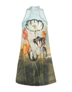 crêpe, senza applicazioni, fantasia floreale, collo alto, senza maniche, interno sfoderato, zip, senza tasche, modello a trapezio