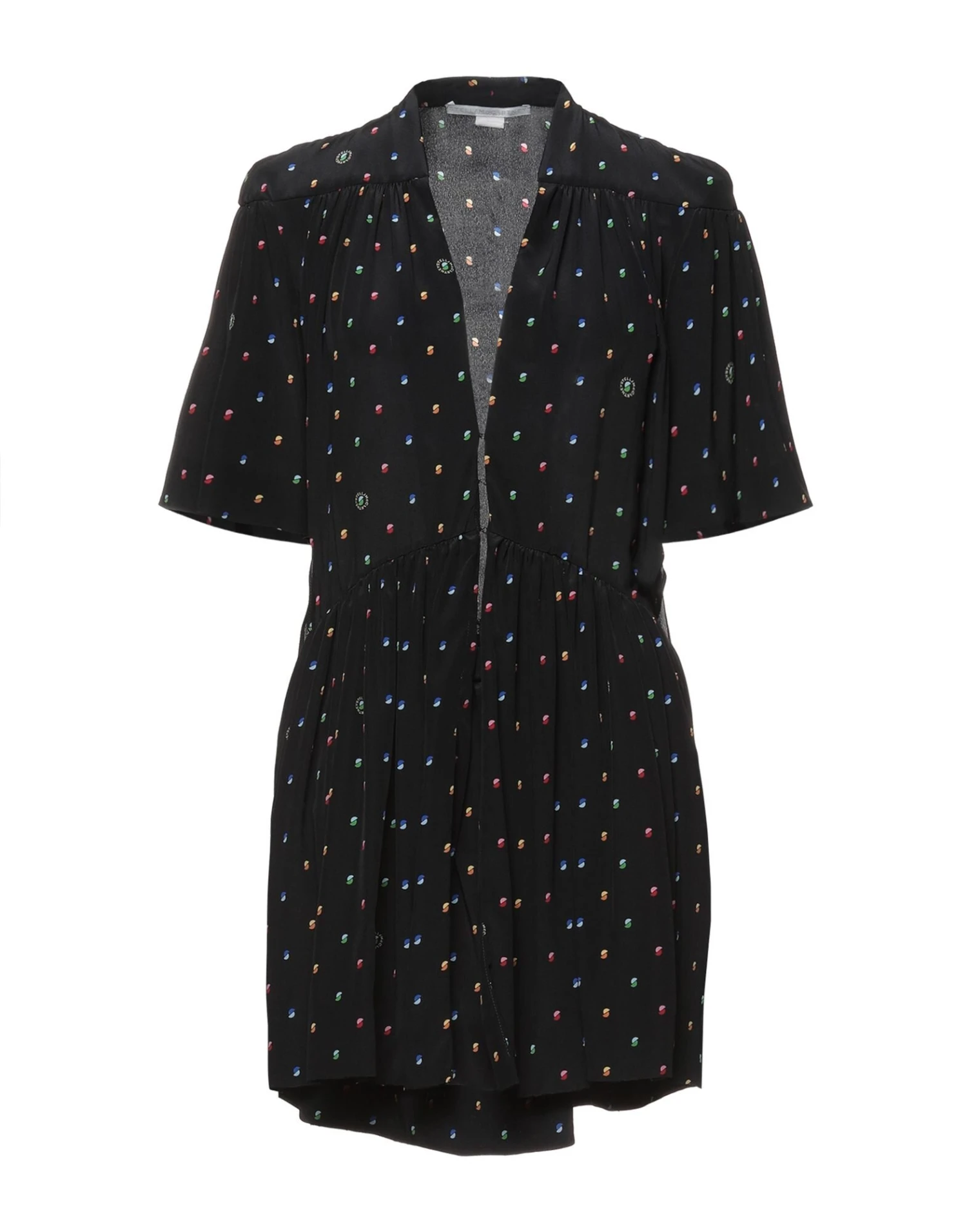 crêpe, logo, fantasia multicolore, collo a v, maniche corte, senza tasche, chiusura sul fronte, gancetti, interno sfoderato