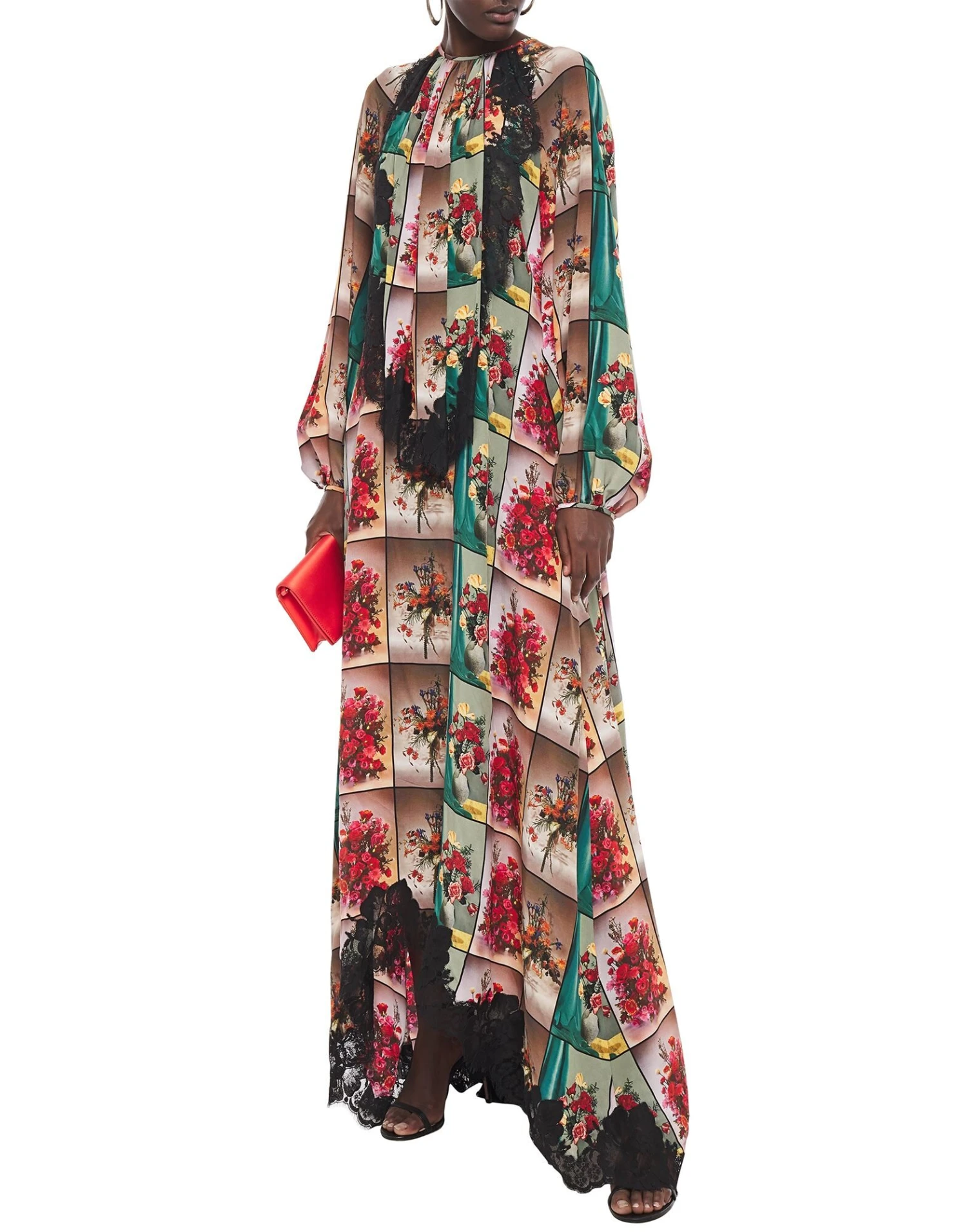 raso, pizzo, cintura, fantasia floreale, collo tondo, maniche lunghe, zip, gancetti, senza tasche, modello a trapezio