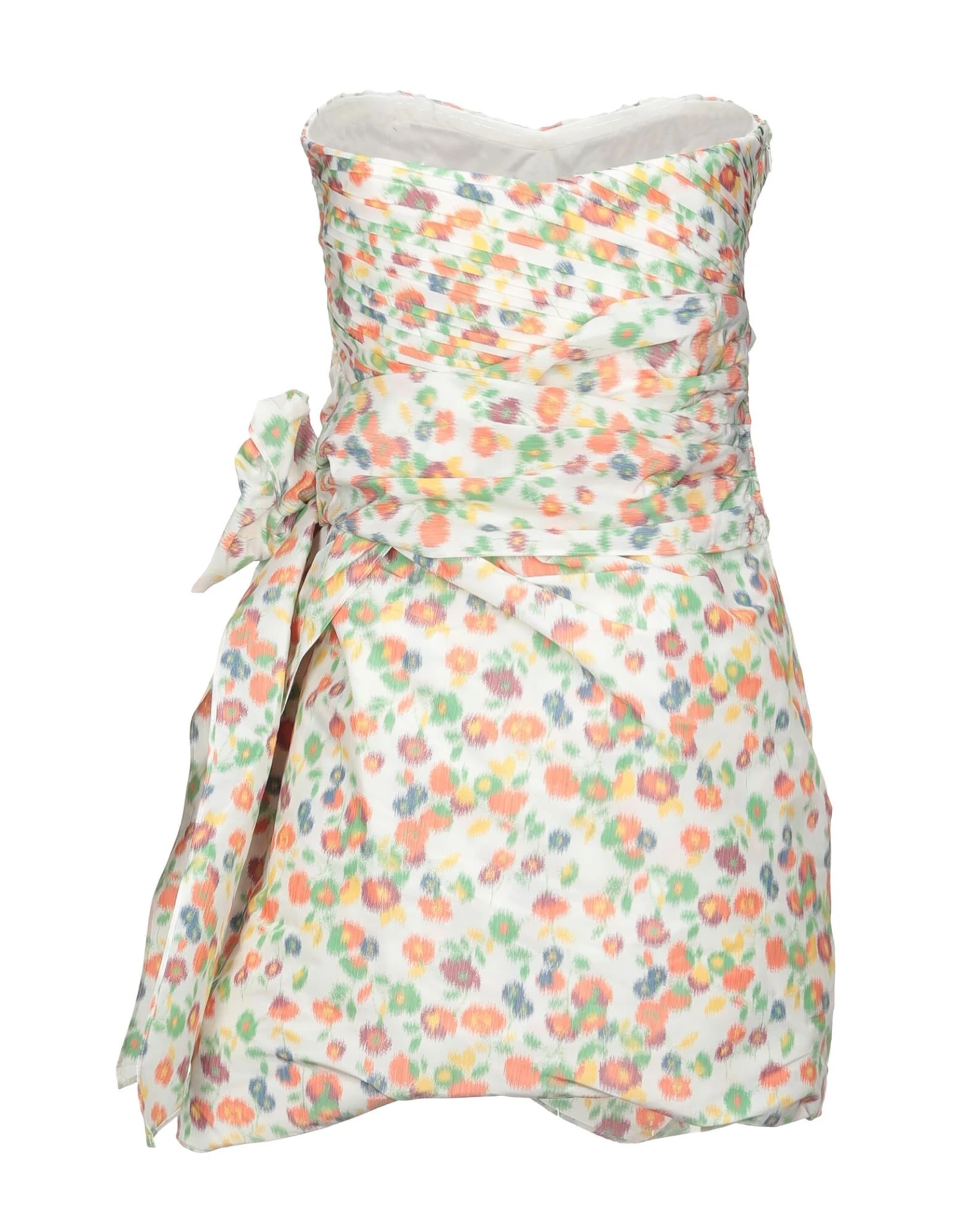 tessuto tecnico, fusciacca, pieghe, fantasia floreale, collo con scollatura profonda, senza maniche, senza tasche, chiusura sul fianco, zip e gancetto, interno con stecche