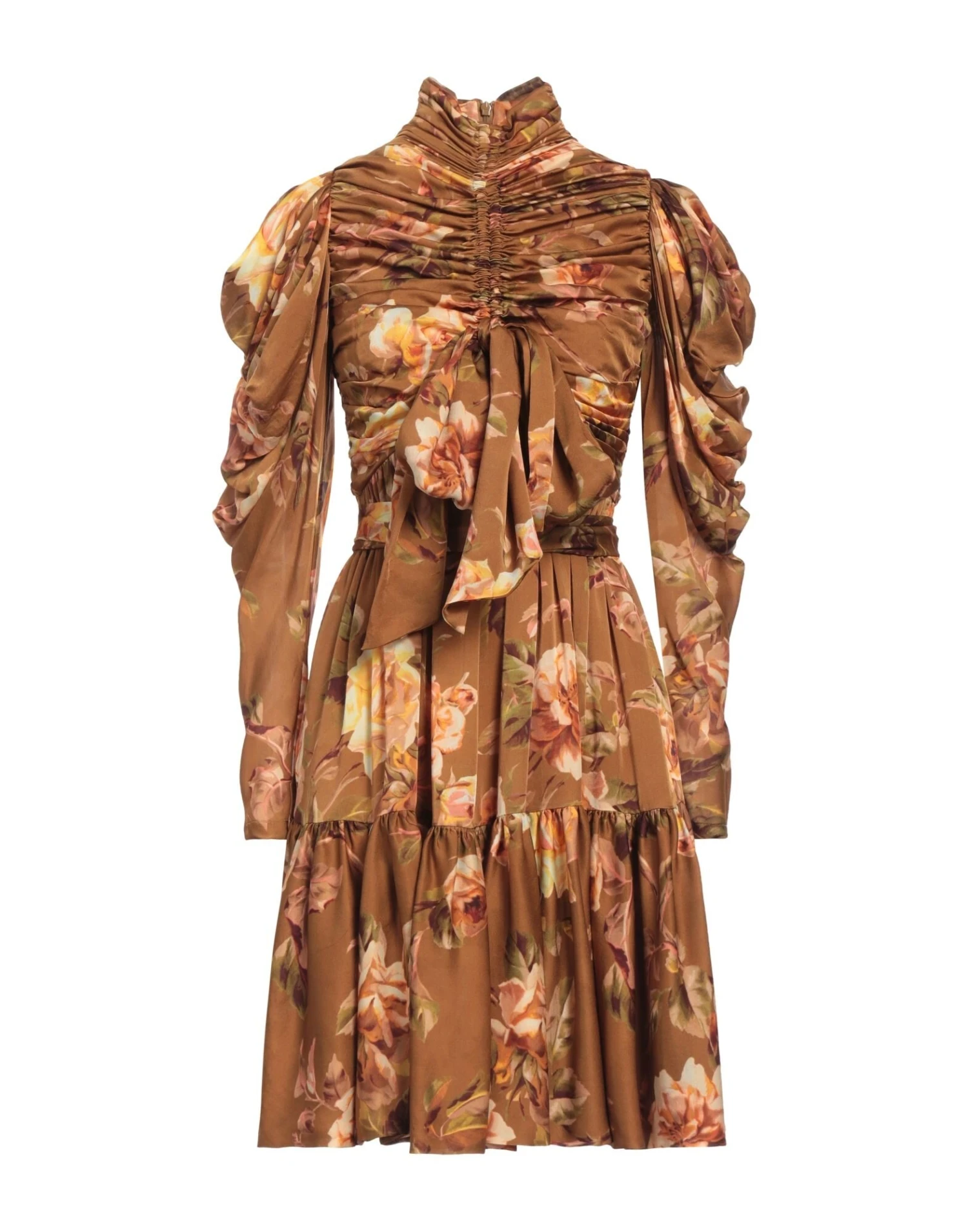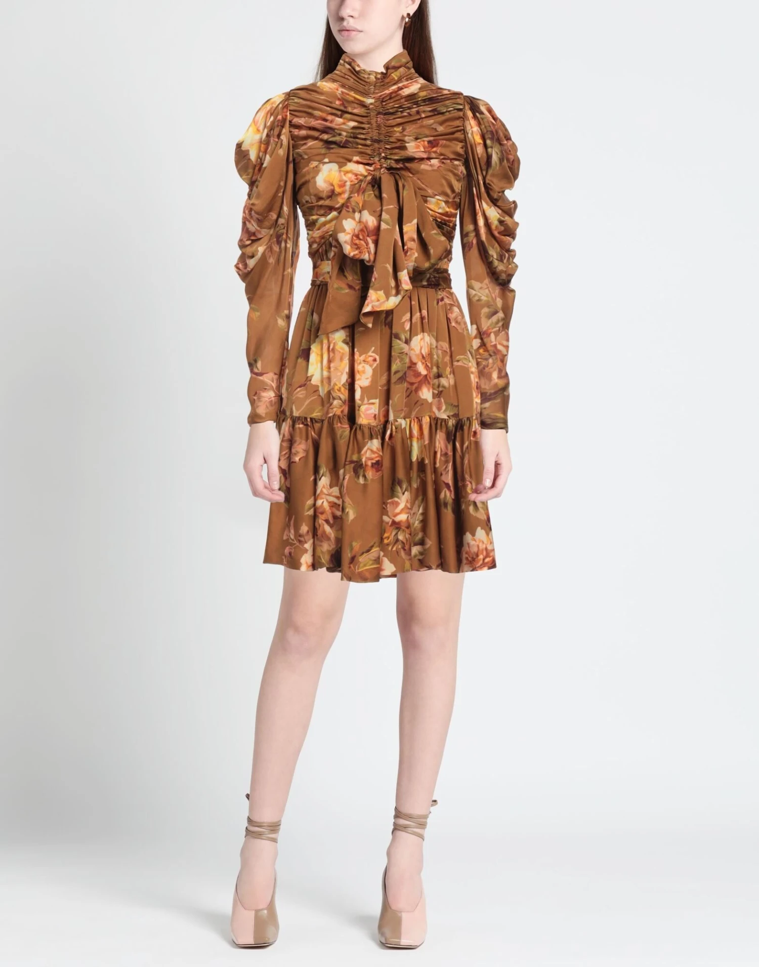raso, cintura, drappeggi, fantasia floreale, collo alto, maniche lunghe, interno foderato, zip, senza tasche