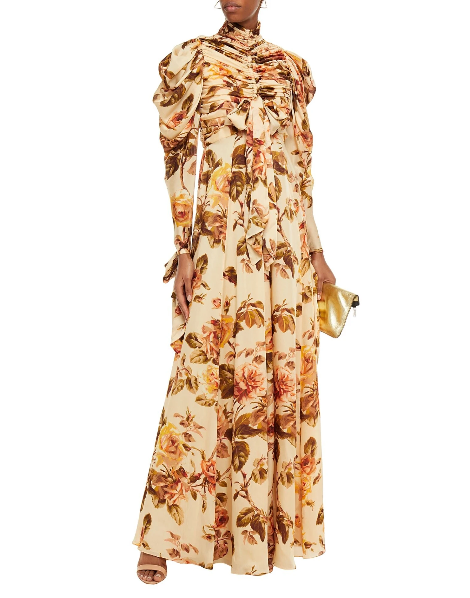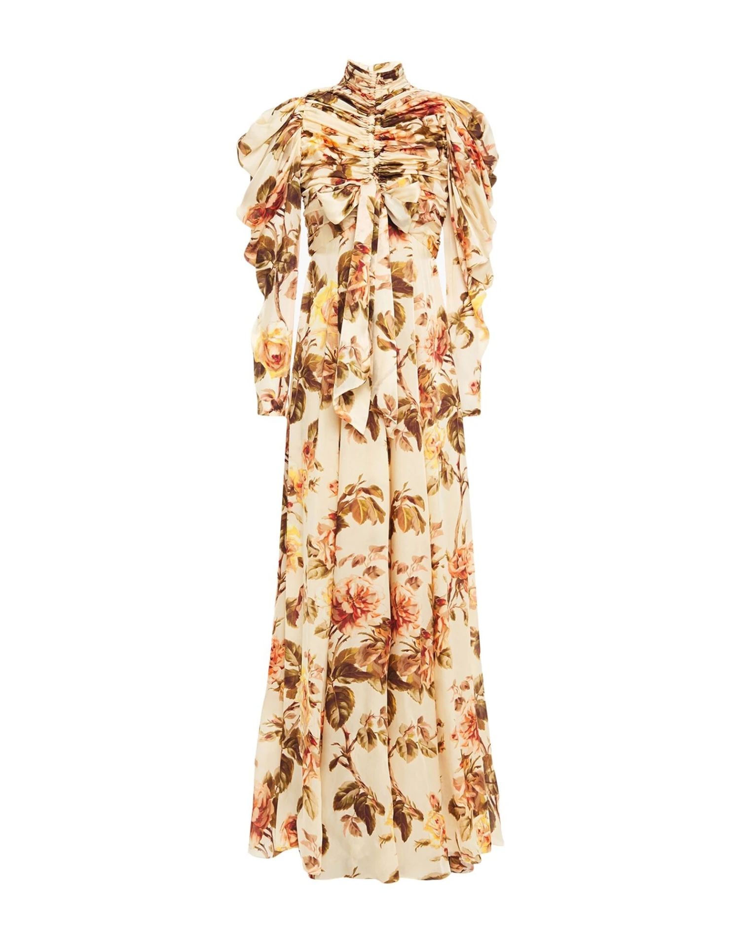raso, arricciature, fantasia floreale, collo alto, maniche lunghe, interno foderato, zip, senza tasche, modello a trapezio